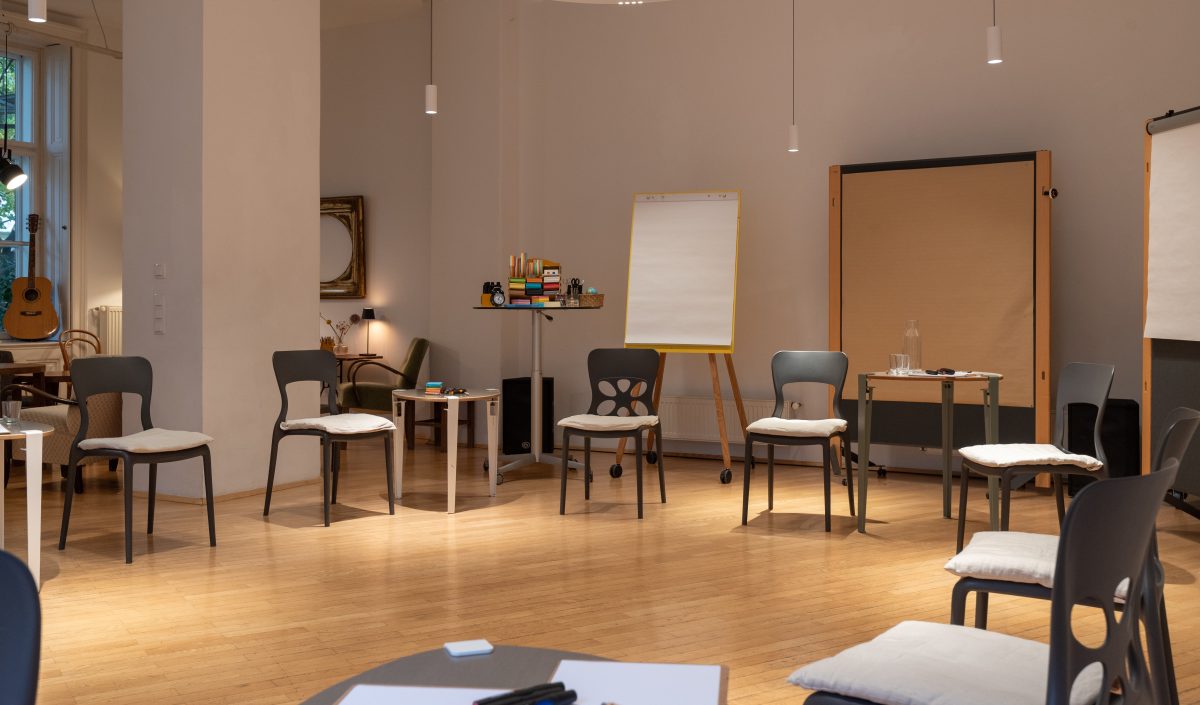 Der Raum (ca 60m2 ) gliedert sich in einen großen Bereich, in dem in verschiedenen Settings gearbeitet werden kann. Außerdem haben wir einen kleineren „Lounge-Bereich“ eingerichtet, der sich gut für kleinere Gruppen eignet.
