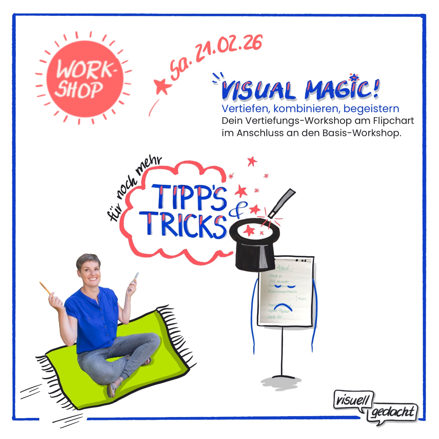 Du möchtest deine Visualisierungs-Basics festigen und tiefer eintauchen? Dann bist du hier genau richtig. Dieser Workshop setzt die Grundlagen meines Kompaktworkshops „Visualise it!“ oder eines anderen Basis-Workshops voraus. Wir gehen einen Schritt weiter und verfeinern deine Visualisierungstechniken, sodass du mit Kombinationstechniken auch komplexere Bilder darstellen kannst und deine Visualisierungen an Tiefgang gewinnen.